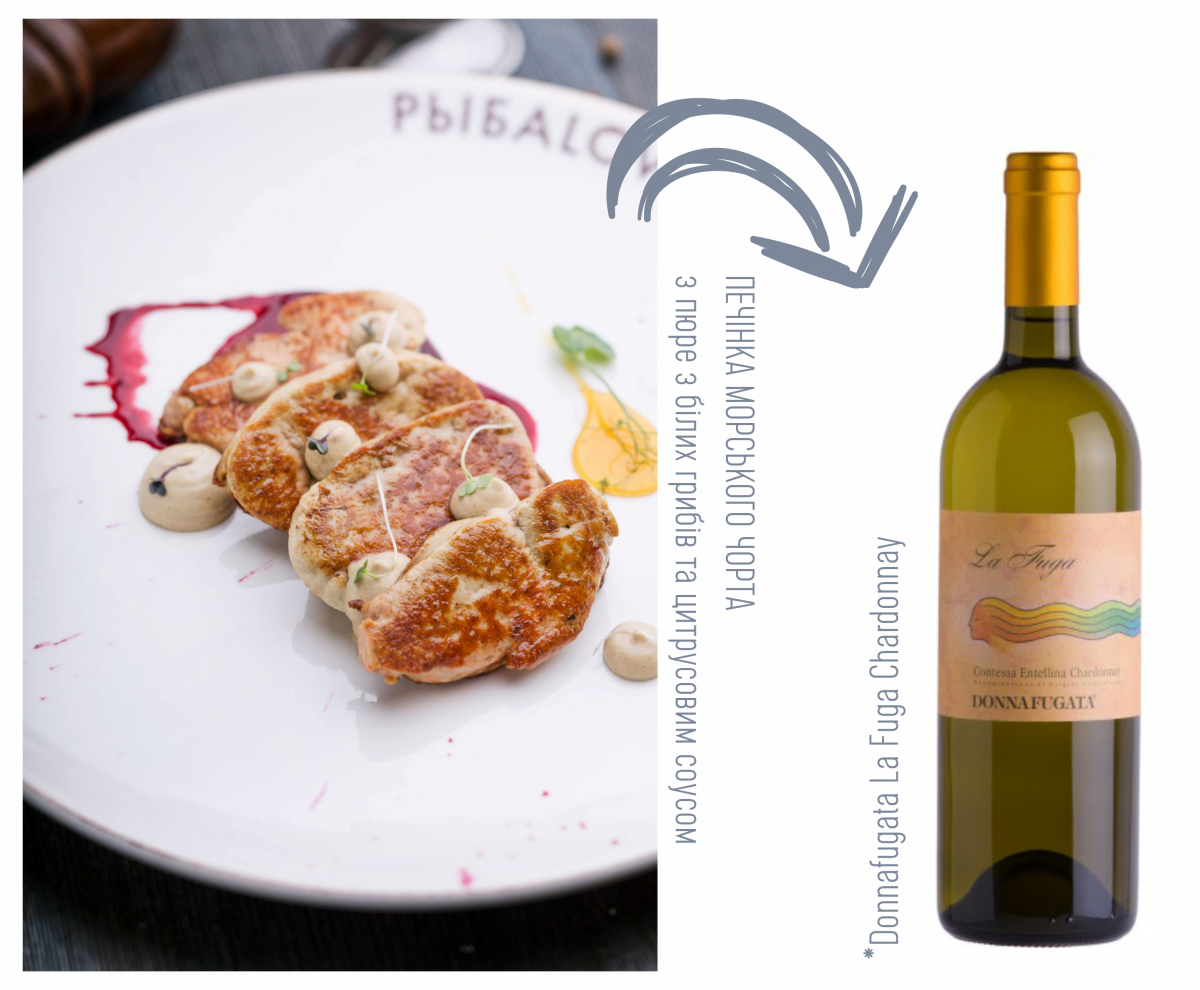 Це цікава страва. Насичена, як і всі страви з печінки морського чорта. Для гармонійної пари я рекомендую нетипове, але надзвичайне цікаве сицилійське вино - Donnafugata La Fuga Chardonnay. Виноград для цього вина збирається в першій частині серпня та виготовляється за досить складною технологією. Це сповнене сонцем потужне італійське вино, приємна кислотність якого та соковитий свіжий смак так гармонують зі стравою.