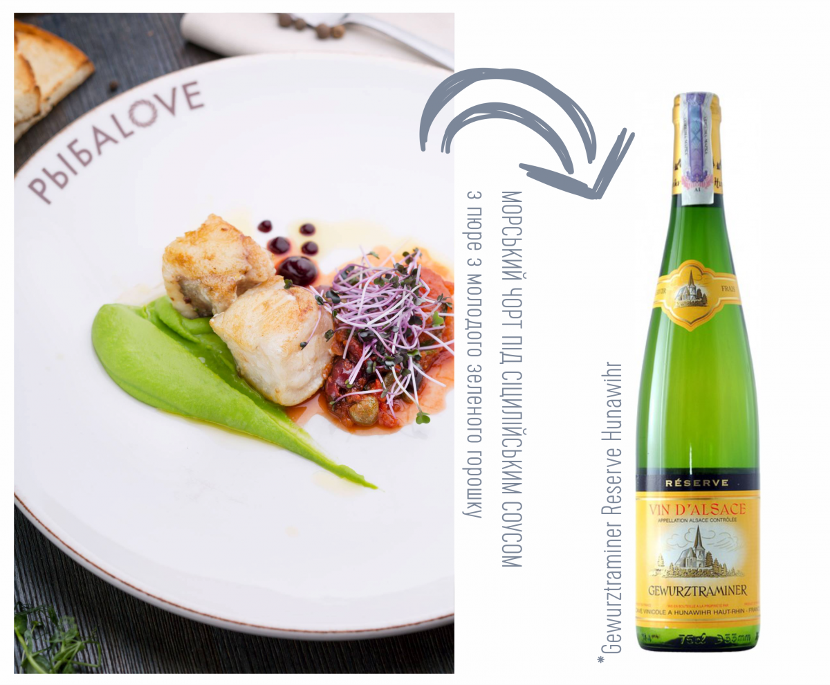 В даному випадку я орієнтувався на смак на гостро-кислого соусу, шо подається до риби. Пропонує цікаве напівсухе біле вино - Gewurztraminer Reserve Hunawihr. В його смаку – потужний букет солодких екзотичних фруктів. Коли він поєднується з гострим соусом, з’являється чудовий «третій смак», який є ознакою ідеальної еногатсрономічної пари.