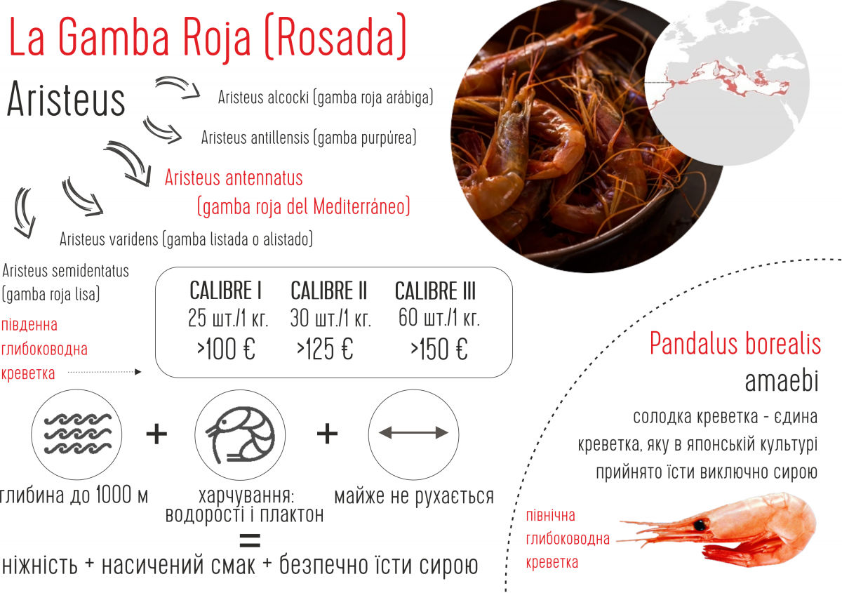 La Gamba Roja – глибоководна креветка з іншої частини світу, але з дуже подібними гастрономічними властивостями. Вона живе на глибині до 1000 метрів – в чистих холодних водах. Харчується водоростями та плактоном. Майже не рухається, тому має дуже ніжну текстуру та приємний насичений солодкий смак. Це продукт, який відкриває нові грані того, якою захоплюючою може буде простота.