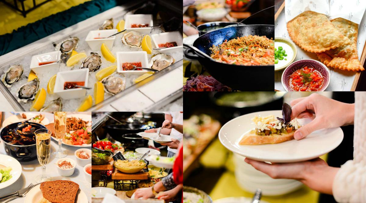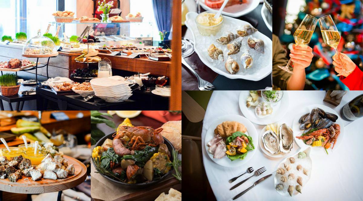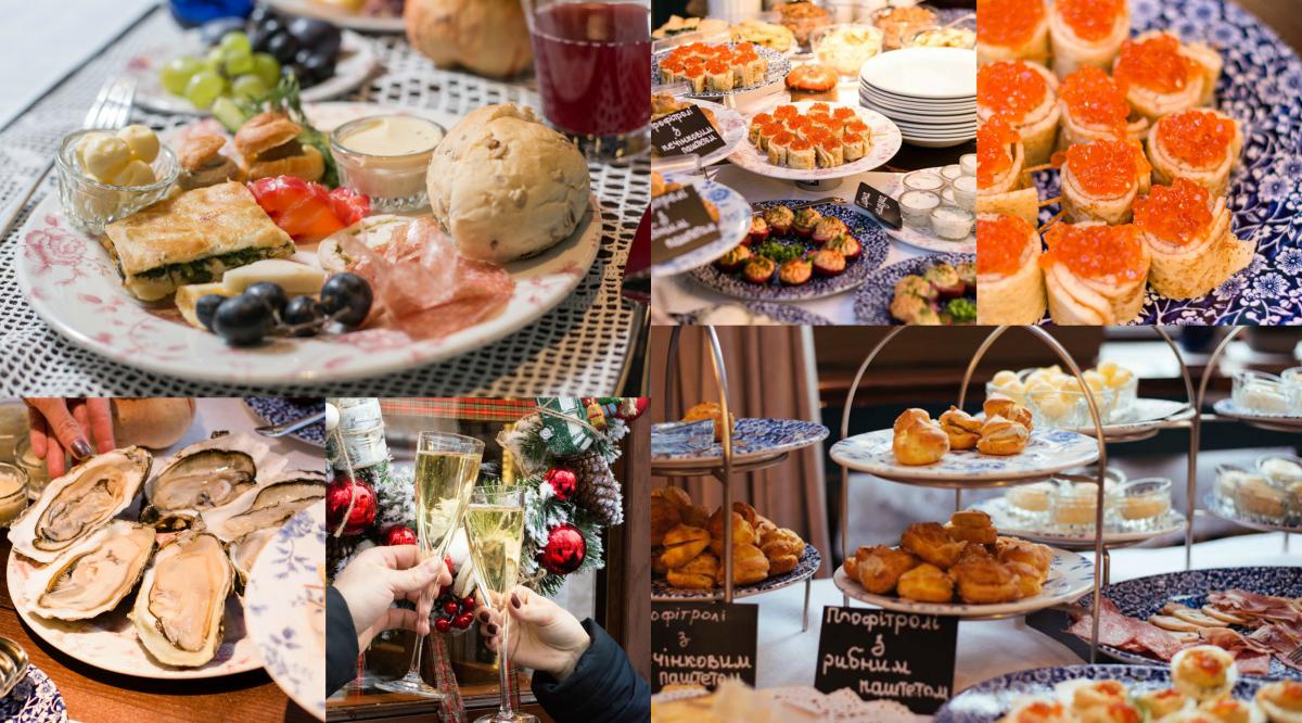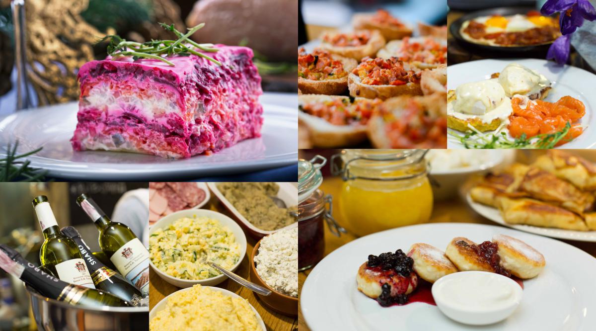 Меню: різдвяна кутя, устриці, млинці з ікрою форелі, лосось гравлакс, профітролі з паштетами, сирні намазки зі спеціями, м'ясне спеціалітети: рулет курячий, парма, ковбаса наполі, сет вишуканих сирів, фаршировані яйця, свіжі овочі, мюслі з молоком, гранола з чорною смородиною і домашнім йогуртом, млинці з сиром зі сметаною і шоколадною вишнею, млинці з маком, свіжа випічка, гріссіні з сиром, пиріг зі шпинатом і рибою, дріжджовий пиріг з вишнею, тертий пиріг з яблучним повидлом, мафіни з цукатами, кекс, сезонні фрукти, мікс горіхів, мікс сухофруктів, сирники зі сметаною, скрембл, київські сосиски, яєчня на вершковому бріоші, яйця пашот на грінці під сирним соусом, овочі гриль, узвар, ігристе, біле та червоне вино.