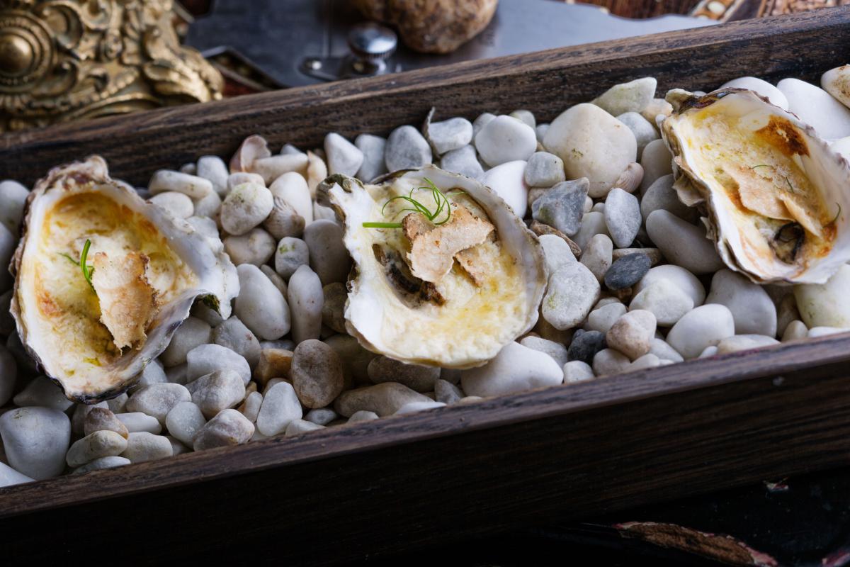 Три херсонські устриці, запечені у вершково-сирному соусі з білим трюфелем (169 гривень)