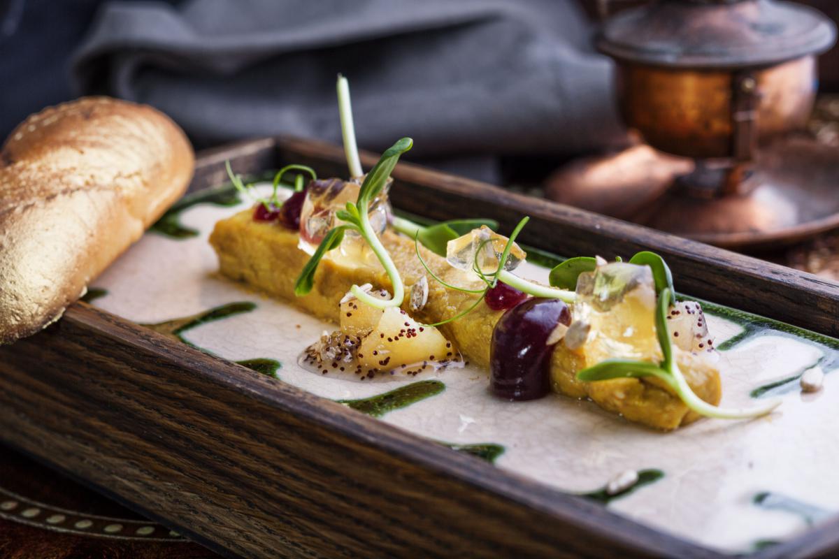 Паштет з гусячої печінки, маринованої у білому вині, з желе із яблучного квасу, грушево-маковим лекваром та підсмаженою здобою (198 гривень)