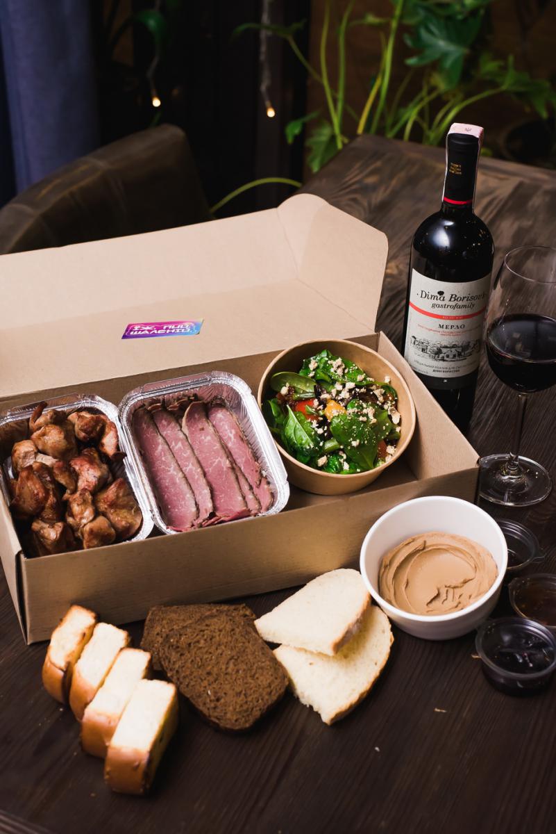 Пляшка червоного сухого вина Gastrofamily та найпопулярніші BBQ-страви від Ватри: