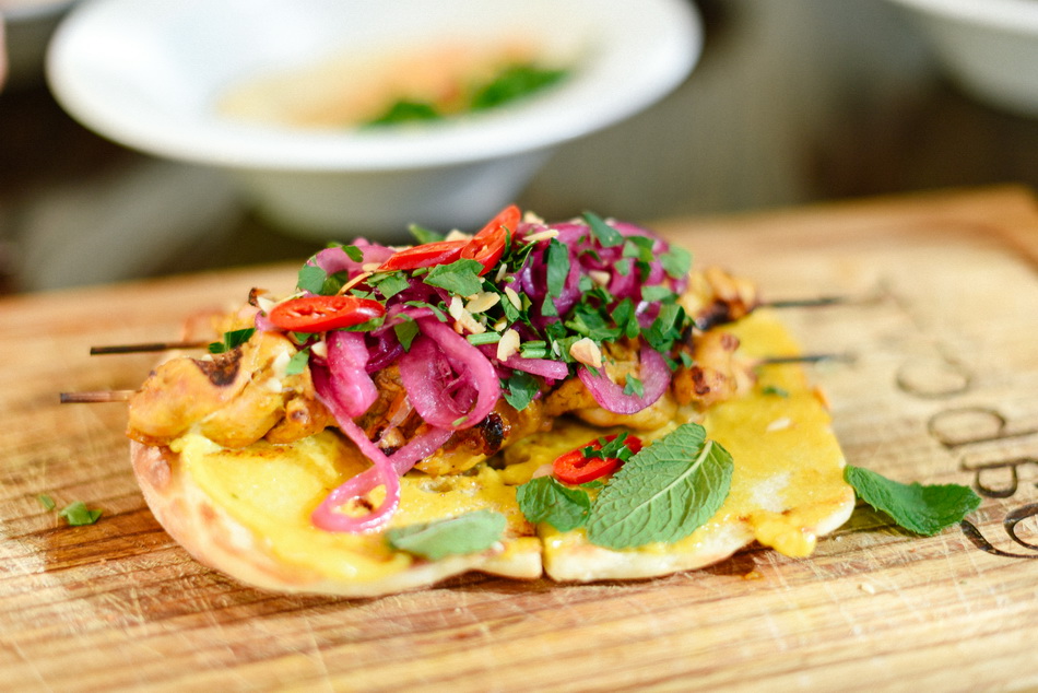 Курячий шашличок (4 шпажки) з маринованою цибулею, соусом айолі-карі та лавашом