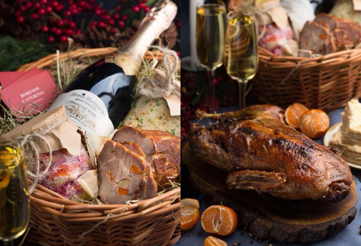 Великий кошик: 2-кілограмова печена качка з яблуками, по півкило "Олів'є" та "Оселедця під шубою", півкило смачної буженини, кілограм домашнього "Наполеону", кутя та пляшка ігристого.
