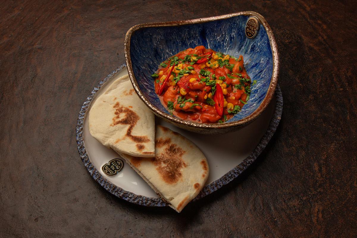 Це сімейний рецепт Марії Юдіної, художниці й волонтерки родом з Бердянська. Соковиті південні томати, печені перці, кукуруза з-під Бердянська і креветки, про які Марія згадує: “Мама смажила цибулю з часником, а ми з татом чистили креветки — це вважалась найскладніша робота на світі