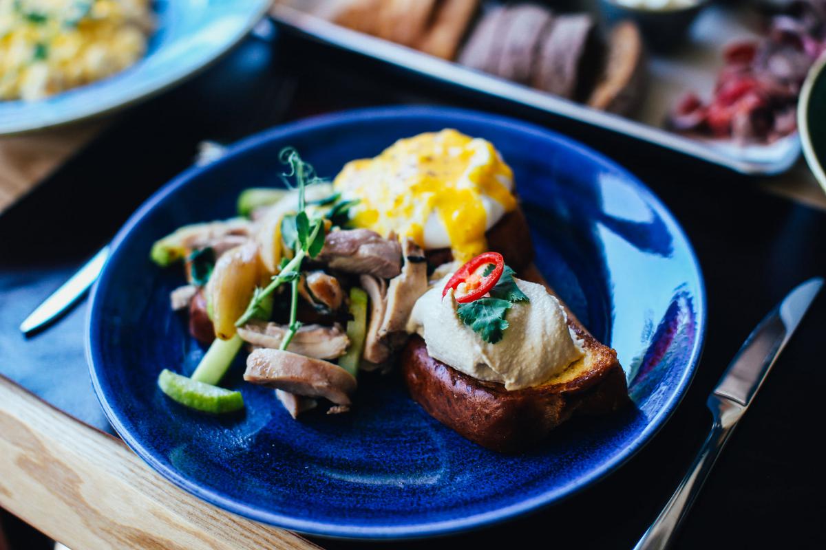 Яйця пашот на вершковому бріоші із запашною грильованою куркою, хумусом, кабачками і соусом голландез - 129 гривень