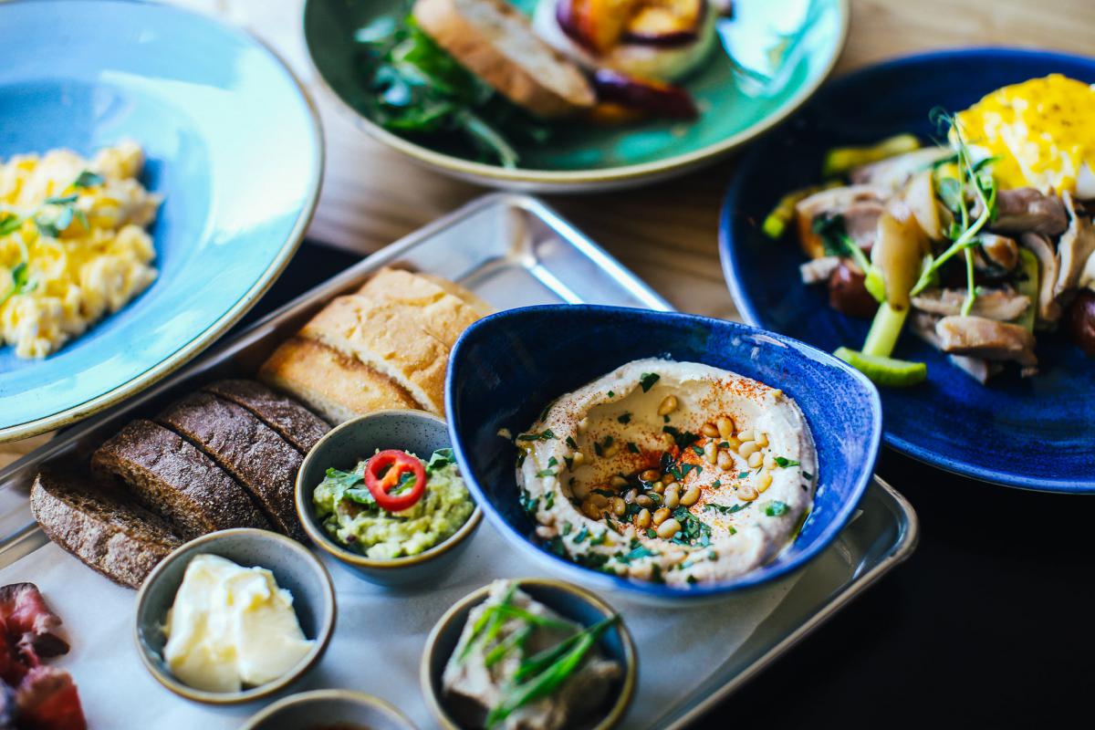 Великий сніданок на двох: сет закусок (форшмак, лосось гравлакс, гуакамоле, хумус), чіабата з аджикою та вершковим маслом, дві порції яєцб пашот на бріоші з лососем вбо куркою, две келики вина, кава для двох, сирники з джемом та ліниві вареники з медом - 599 гривень