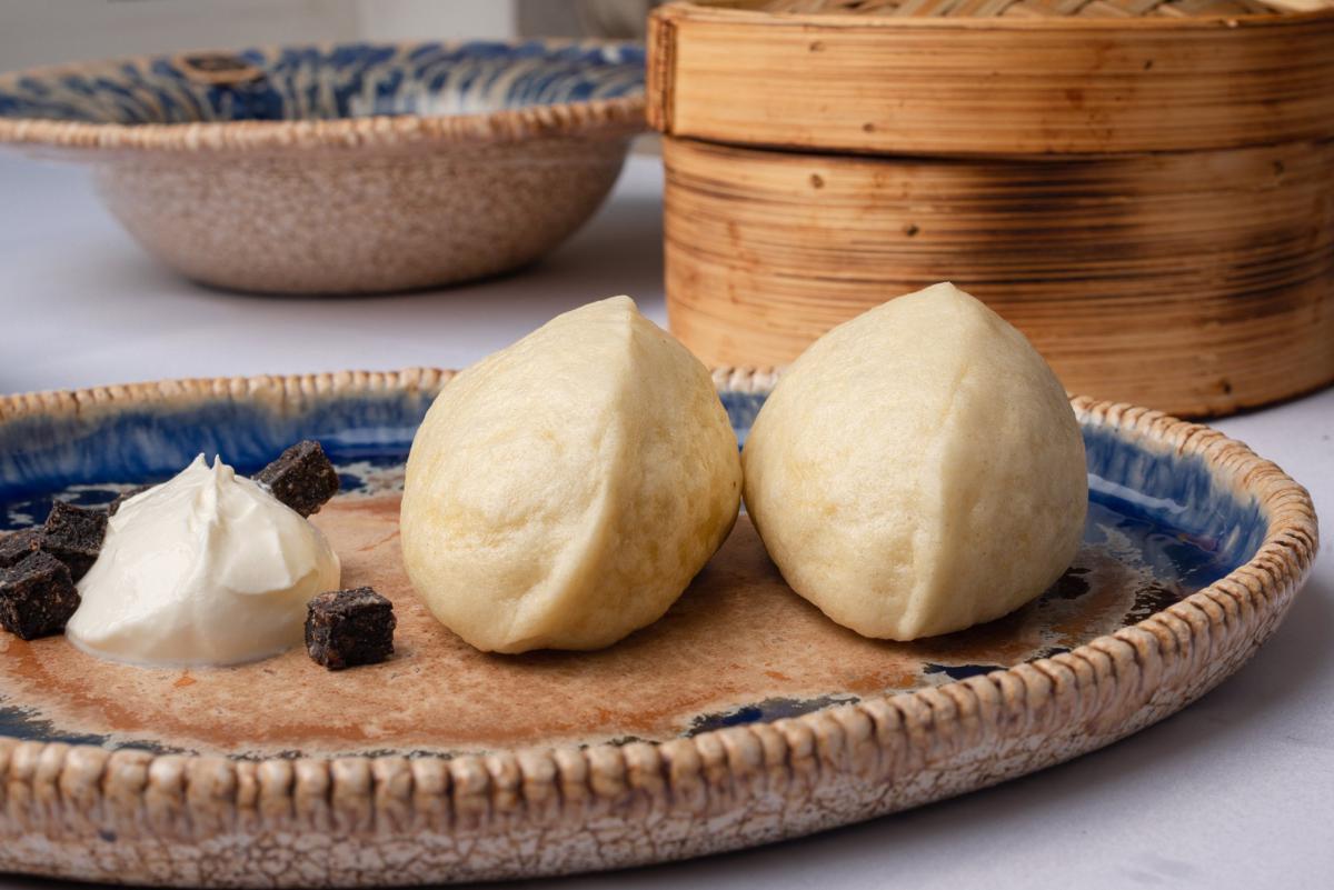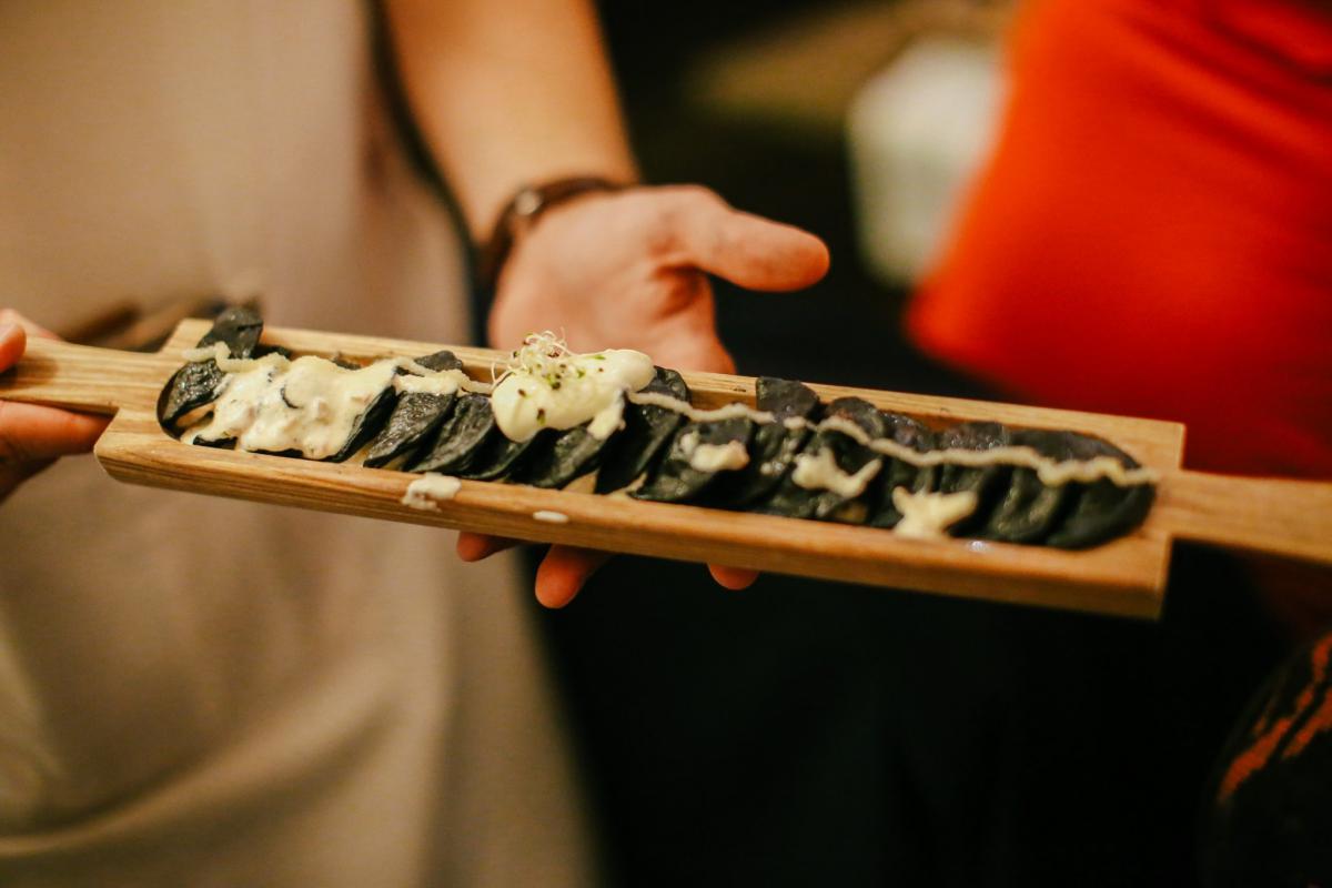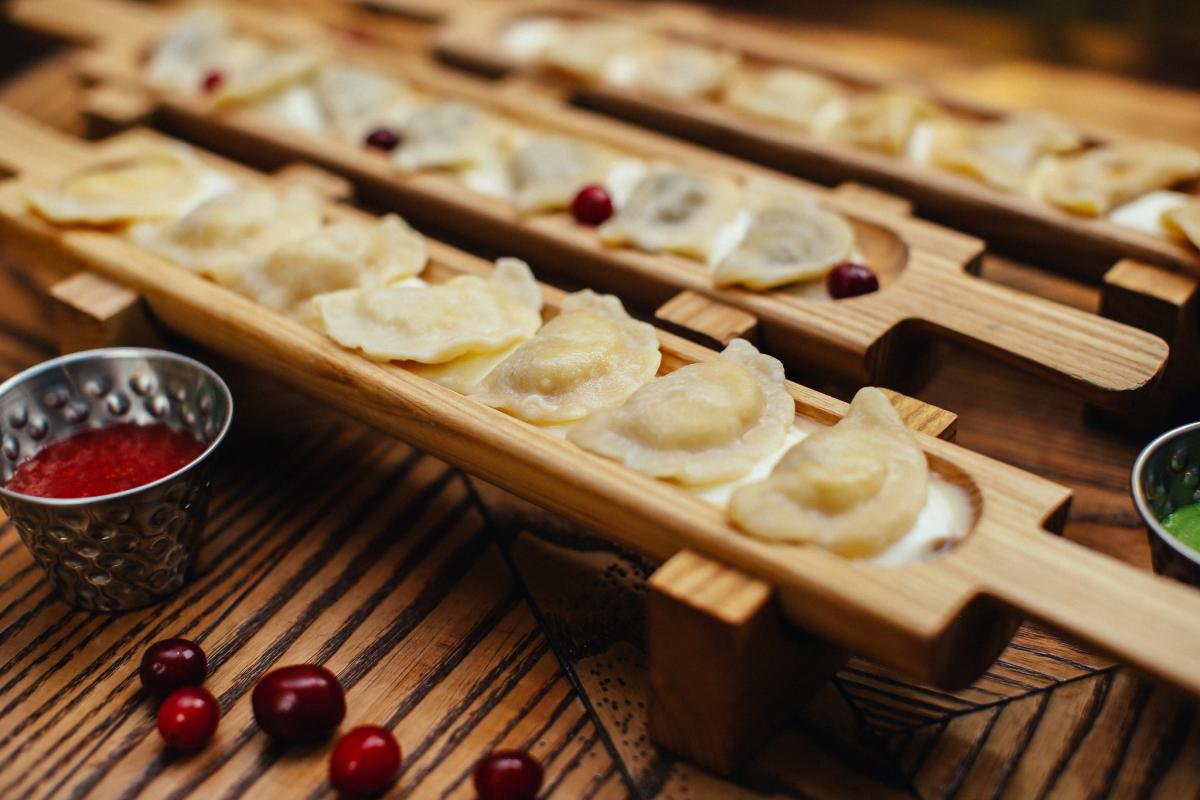 Чорні вареники з судаком, копченим салом і кав'яром оселедця — 159 грн