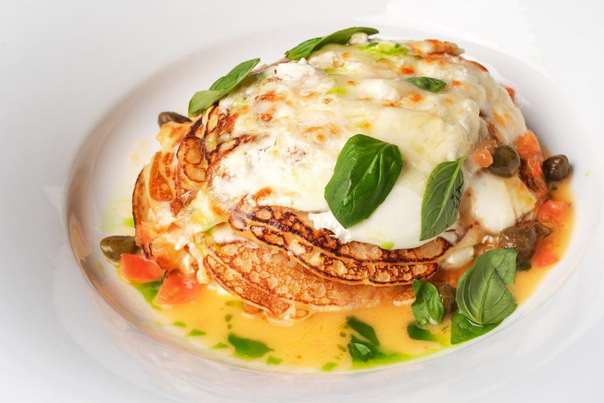 Млинці з лососем, моцарелою, каперсами і базиліком — 198 грн
