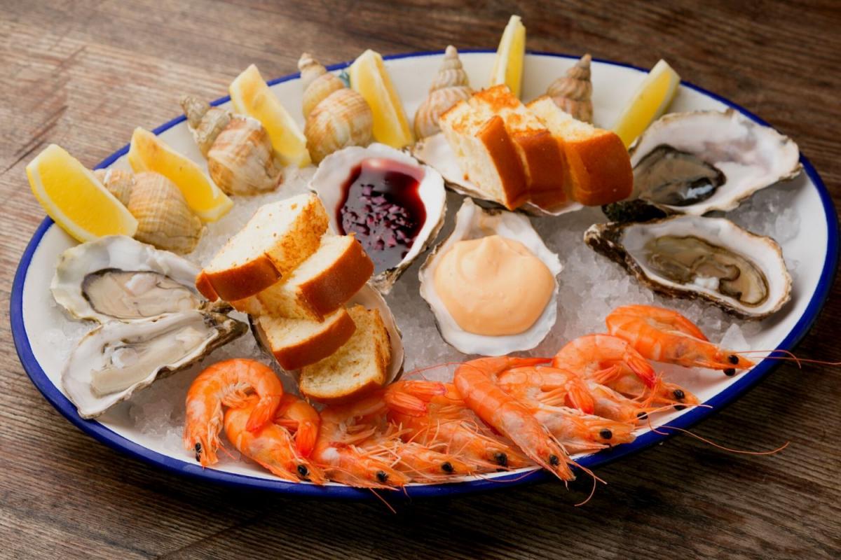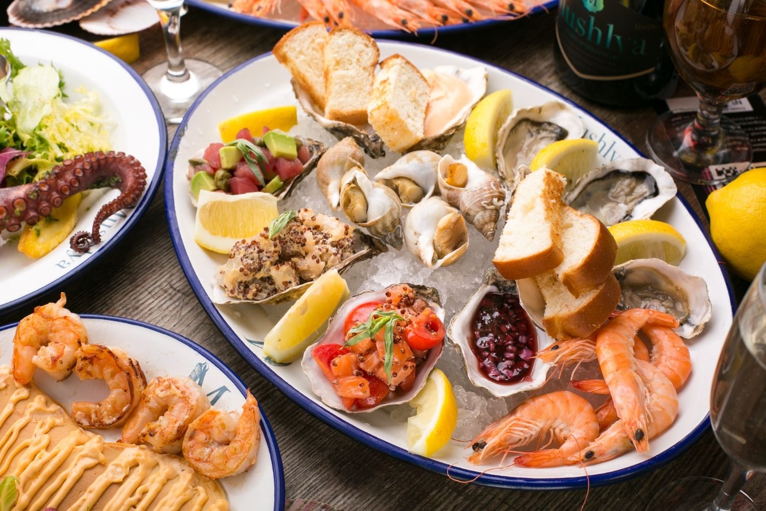 Устриці Fine de Claire 3 шт., лимон, 10 білоногих креветок, тартар із дорадо з соусом крем-чилі світ-чилі, тартар із лосося з червоним кіноа, тартар із тунця з м'ятою та трюфельною олією та вершковий багет.