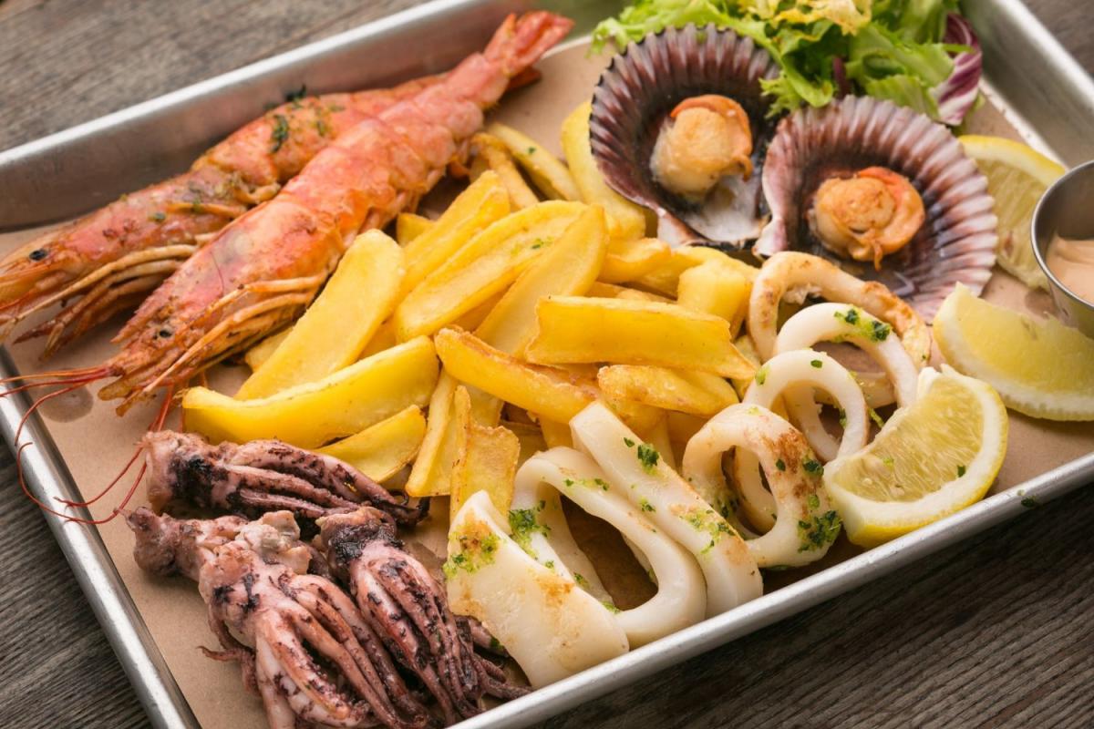 Щупальця кальмара, морські гребінці в мушлях (2 шт.), кальмари, величезні дикі аргентинські креветки (2 шт.), мікс салатів, соус крем-чилі, соус світ-чилі, картопляні діпи та лимон.