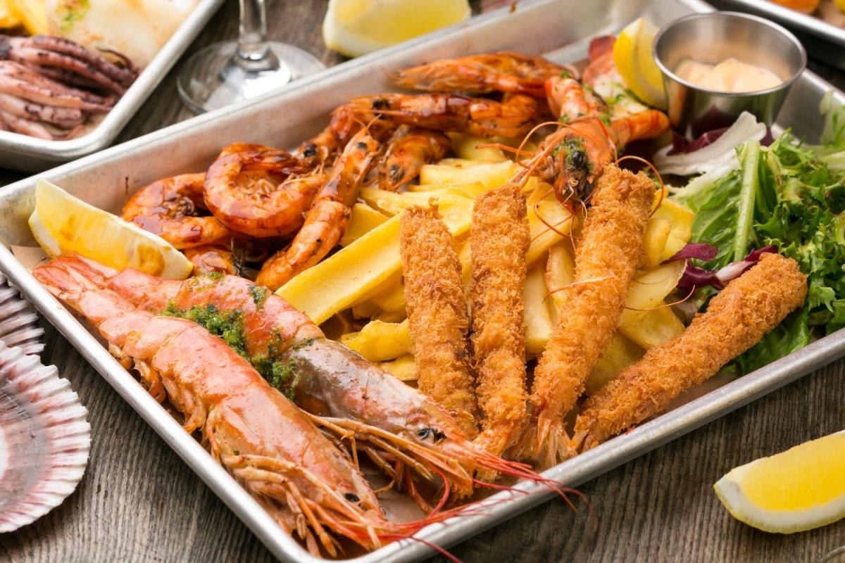 Ну дуже делікатесне плато: величезні дикі аргентинські креветки, тигрові креветки темпура, глибоководні креветки, білоногі королівські креветки гриль, картопляні діпи, листя салату, соуси теріякі та крем-чилі, лимон.