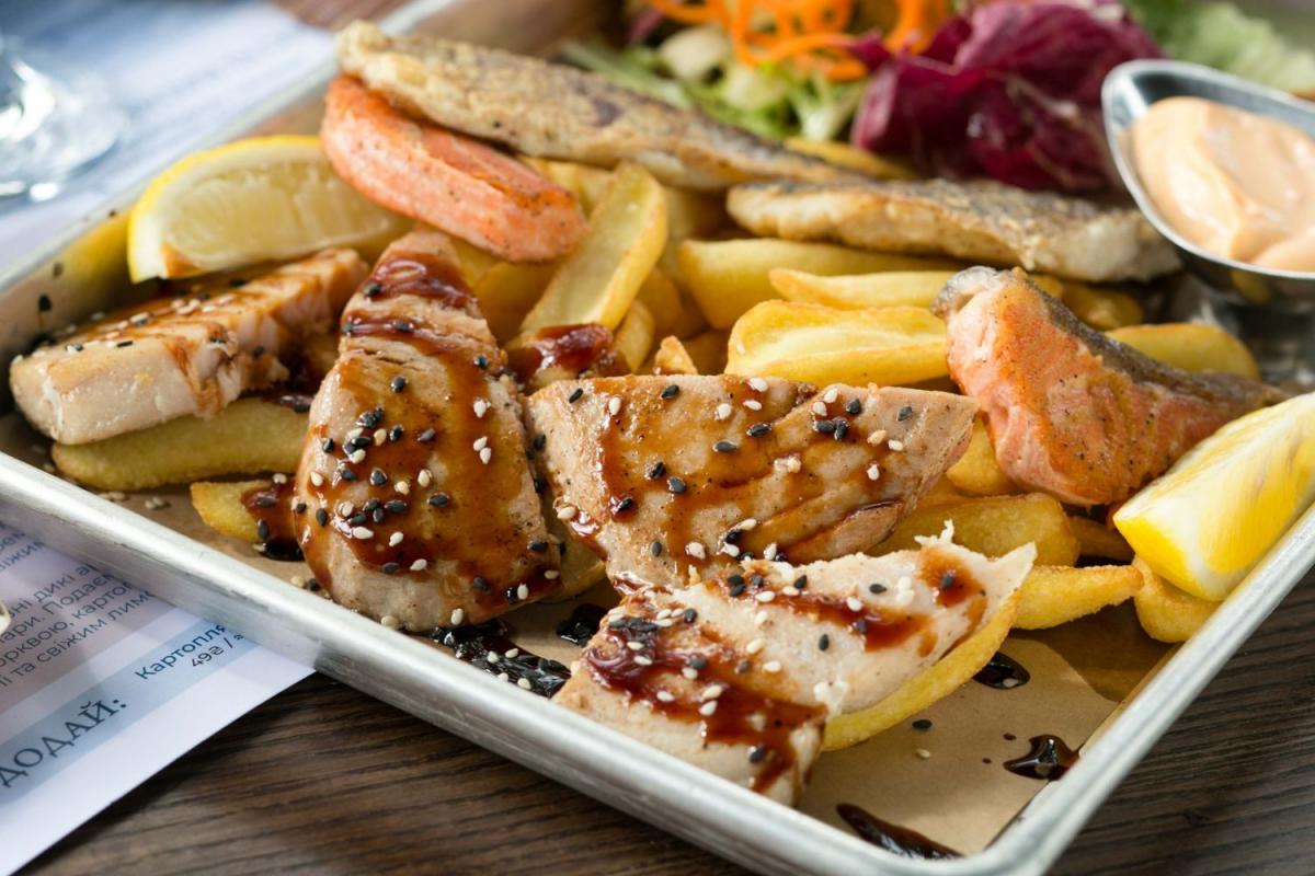 Стейки з лосося і тунця, філе дорадо і морського окуня гриль, мікс салатів, соус крем-чилі, картопляні діпи, лимон.