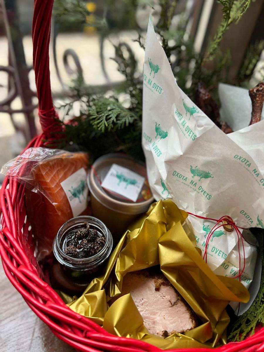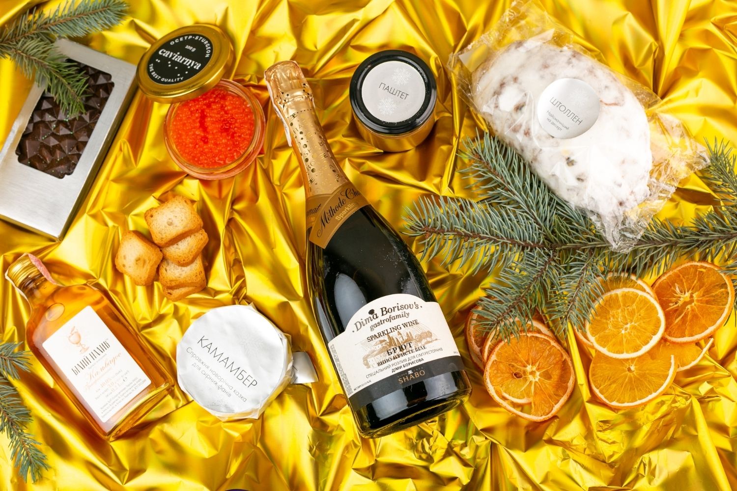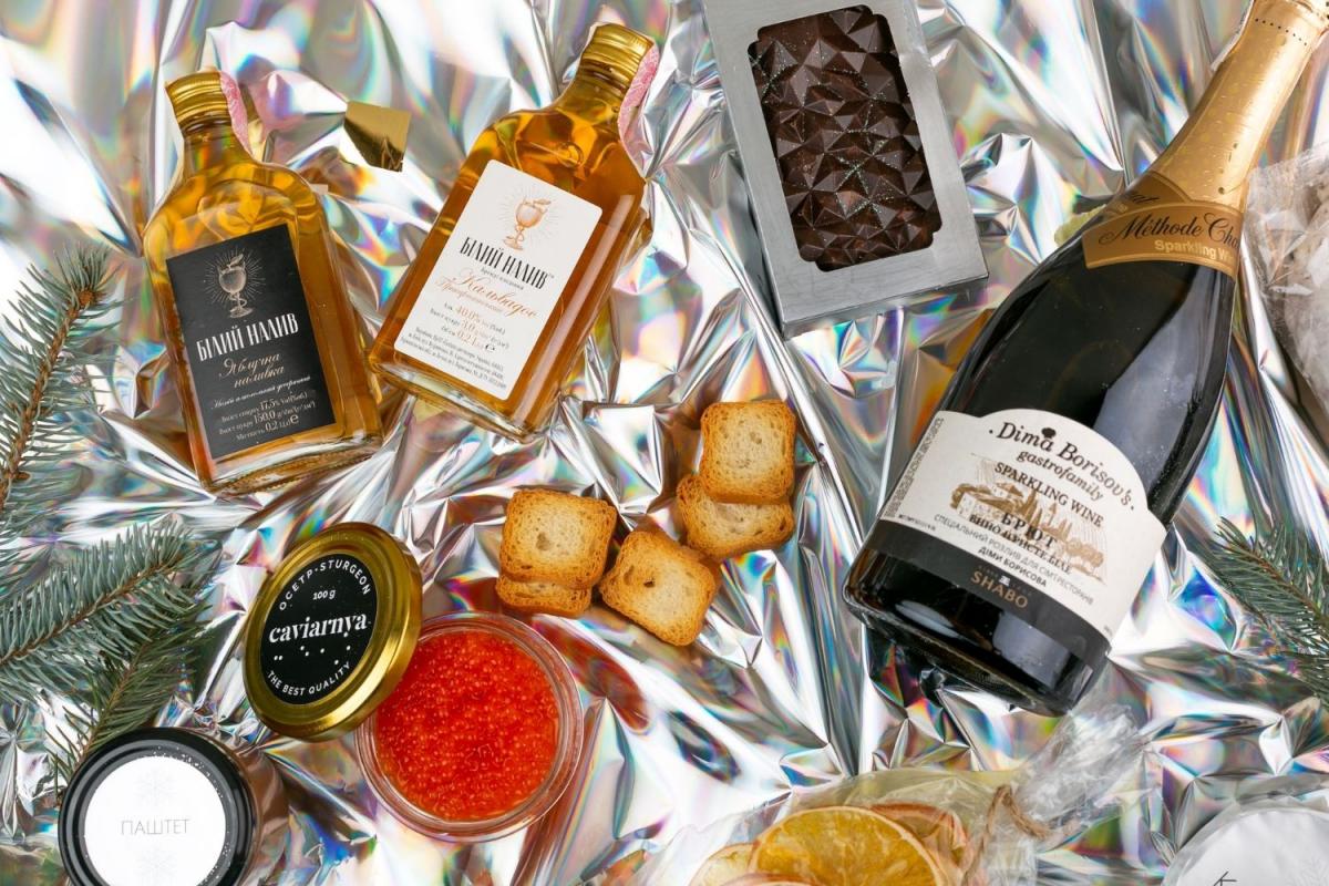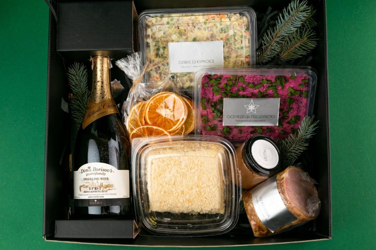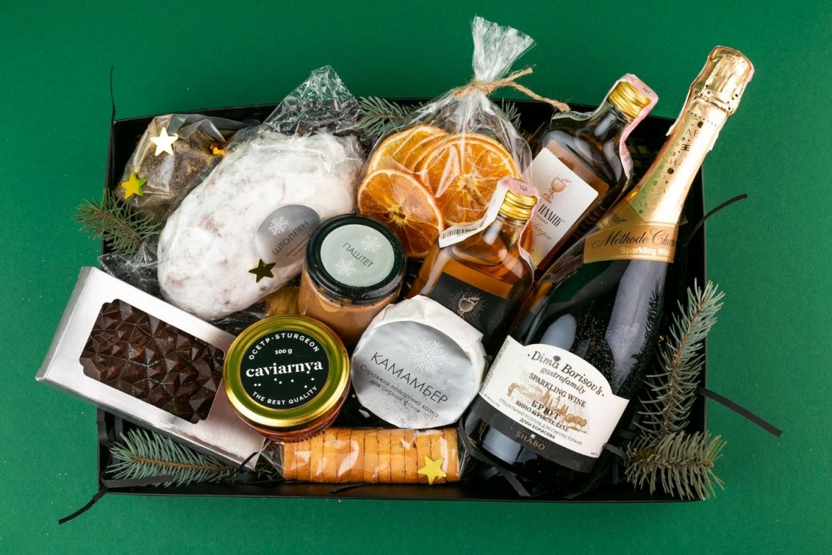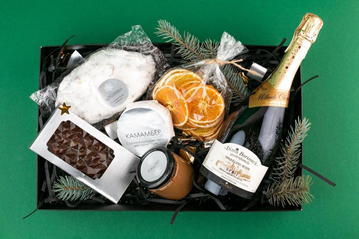 Банка червоного кав'яру (форель), сир камамбер, ніжний паштет, святковий штоллен, апельсинові чипси, крафтовий шоколад, яблучна наливка “Білий Налив” (0,2 л), кальвадос "Білий Налив" (0,2 л), пляшка брюту Gastrofamily